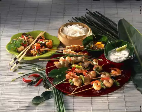 Wash the prawns and dab them dry. Put two prawns with some lemon leaves on wooden skewers. Wash the chicken meat as well and pat dry. Cut into thin oblong strips and put them on wooden skewers in a wavy shape. Fry the skewers briefly one after the other in hot oil on both sides. Season with salt and pepper. Cook rice in plenty of boiling salted water for about 10 minutes and drain. Put the vegetables in a pan without defrosting them and fry them for 3-5 minutes at high heat. Then stir-fry over medium heat for 4-6 minutes.
