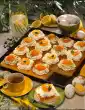 Lightly roast the coconut flakes in a pan without fat. Peel garlic and press it through a garlic press. Mix crème fraîche, lime juice, garlic and coconut flakes. Season to taste with salt and pepper. Mix chutney and green peppercorns.