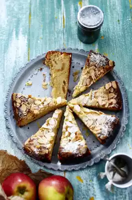 Beat the egg whites until stiff and add 100 g sugar. Approx. 1⁄3 Fold the beaten egg white into the dough. First fold in apples, then the rest of the beaten egg white. Fill into the mould and sprinkle with almond flakes.