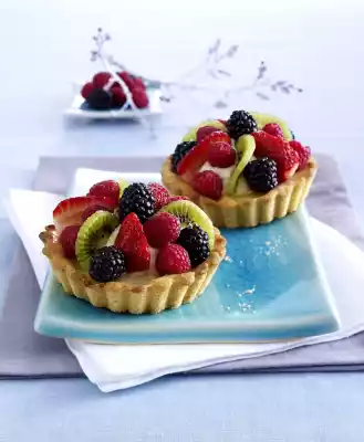 For the dough, cut 1 vanilla pod lengthwise and scrape out the pulp. Knead flour, 60 g sugar, butter in pieces, 1 egg, 1/2 packet baking powder and vanilla pulp to a smooth dough. Wrap dough in foil and chill for about 30 minutes. Grease 8 tartlet cups (10 cm Ø) and dust with flour. Roll out dough thinly between 2 layers of foil. Cut out circles (14 cm Ø). Knead the dough again, roll out and cut out 8 circles. Line a mould with them, press the dough slightly. Remove excess dough at the edges with a knife (with the back of the knife). Line the tartlet cups with double-layered cling film (or baking paper), cover with dried peas and twist the film over the dried peas to form small bags (not necessary for baking paper). Pre-bake in a preheated oven (electric oven: 150 °C/ convection oven: 125 °C/ gas oven: level 1) for approx. 25 minutes. Remove dry pea bags. Let the tartlets cool down in the tartlets on a cake rack. In the meantime, finely chop the candied fruits for the ricotta cream. Mix ricotta, 60 g sugar, 1 egg, pudding powder, olive oil, 150 ml milk, cinnamon, candied fruit and orange blossom water. Place the tartlets in the moulds on a baking tray. Pour in ricotta cream. Bake in a preheated oven (electric cooker: 200 °C/ convection oven: 175 °C/ gas: level 2) for 20-25 minutes until the cream has set. Leave the Tartelettes to cool in the moulds. Separate 3 eggs. Beat the egg white with 100 g sugar and 1 pinch of salt until stiff. Cut 1 vanilla pod lengthwise and scrape out the pulp. Boil 450 ml milk, pulp and pod. Separate 1 egg. Stir 4 egg yolks with 5 tablespoons of milk and starch until smooth. Remove milk from the stove, remove pod. Stir in starch, bring everything to the boil again and let it boil for about 1 minute. Fold in the beaten egg white immediately. Pour the vanilla cream while still hot into a piping bag with perforated spout and squirt onto the tartelettes. Clean and sort the berries. Quarter the strawberries. Peel the kiwi, halve lengthwise and cut into thin slices. As soon as the vanilla cream has cooled down, spread the fruits decoratively on the vanilla cream. Serve immediately