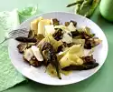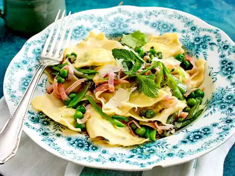 In the meantime cut the remaining mint into strips. Heat butter in a large pan. Sauté sugar snap peas and ham for 2-3 minutes. Add 100 g peas and mint, heat and season with salt and pepper. Remove half of the pea mix from the pan. Add half of the ravioli to the pan and heat up. Arrange on plates and process remaining ingredients in the same way. Sprinkle with mint leaves and sliced pecorino before serving