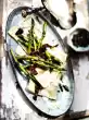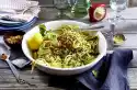 Defrost the peas in a bowl. Wash the sugar snap peas and cut them diagonally into strips. Cut the ham into strips. Wash the lemon, grate dry and grate the peel thinly. Coarsely chop 50 g peas. Wash the mint, shake dry and pluck the leaves. Chop half of the leaves into small pieces. Grate 20 g cheese. Mix ricotta, egg yolk, breadcrumbs, chopped mint, cheese, lemon rind and chopped peas, season with salt and pepper. Pour the mixture into a piping bag with perforated spout