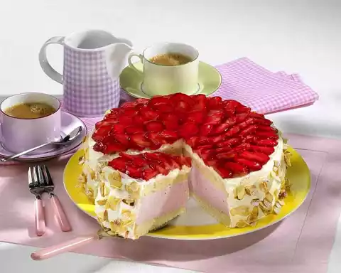 Cut the rest of the strawberries into slices and lay them on the cake like roof tiles. Mix the cake glaze powder and 2 tbsp. sugar. Stir in 1/4 l water, bring to the boil while stirring. Let cool down briefly. Spread on the strawberries. Press almond flakes to the edge of the cake and dust with icing sugar. Chill for at least 30 minutes.