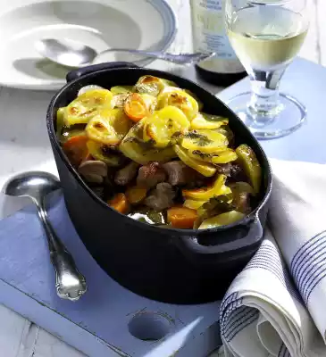 Marinate with the wine mixture for about 24 hours. Peel and wash the potatoes and cut them into thin slices. Peel onions, cut into rings. Layer meat, potatoes and onions in a high heavy pot, finish with potatoes. Fill up with the marinade. Cover and braise in a preheated oven (electric cooker: 200 °C/ convection oven: 175 °C/ gas: level 3) for approx. 2 hours