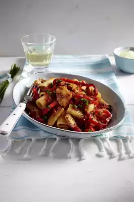 Prepare the pasta in boiling salted water according to the instructions on the packet. Wash the meat, dab dry and cut into pieces. Clean and wash the peppers and cut them into rings. Peel and finely dice onions. Heat oil in a pan.