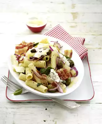 Remove the bacon slices. Sauté onions and sage in the bacon fat for about 5 minutes. Add olives. Slice parmesan. Drain the pasta in a sieve, collecting about 1/4 litre of cooking water. Pour cooking water into the pan and bring to the boil.