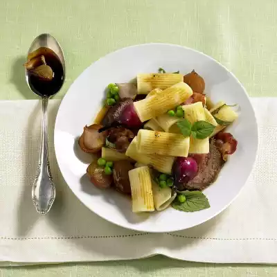 Add the dissolved roast mixture and season with salt and pepper. Cook the shallots for 5-7 minutes. Add peas, bacon, mint and noodles to the stock. Cut the fillet into slices and serve with the noodle mixture.