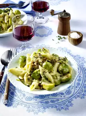 Cook the pasta in boiling salted water according to the instructions on the packet. Drain, quench briefly, drain. In the meantime heat oil and butter in a large pan, add Brussels sprouts and fry briefly.