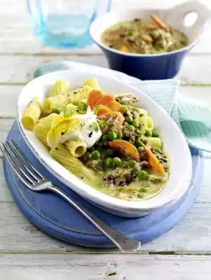 Deglaze with broth little by little. Add peas, oregano and carrots and let simmer for 2-3 minutes while stirring. Stir in 3 tsp. sour cream. Season with curry, salt, pepper and 1 pinch of sugar. Drain noodles and arrange on plates with minced sauce.