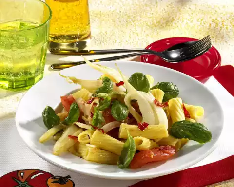 Cut the fennel into fine strips. Pluck the basil leaves. Press garlic through a garlic press. Put the pasta in plenty of boiling salted water and cook for 12-14 minutes until al dente. Sauté the fennel in hot olive oil.