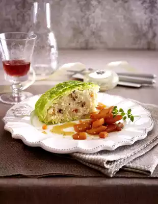 Gradually add 750 ml broth and wine, stirring from time to time. Add the next portion of liquid only when the rice has absorbed the liquid. Cook for a total of 30-35 minutes. Stir in 30 g butter and parmesan. Clean the cabbage. Place cabbage in boiling water for about 5 minutes, remove the outer leaves. Put the cabbage back into the water and remove a total of 8 leaves. Use the rest of the cabbage for other purposes. Put the detached cabbage leaves back into the boiling water and cook for about 4 minutes. Take them out and let them drip off. Grease a metal bowl (2 litres capacity) and lay out the cabbage leaves so that half of the leaves hang over the edge of the bowl. Pour the risotto into the bowl, fold over the leaves. Bake in the preheated oven (electric cooker: 150 °C/ convection oven: 125 °C/ gas: stage 1) for approx. 15 minutes.
