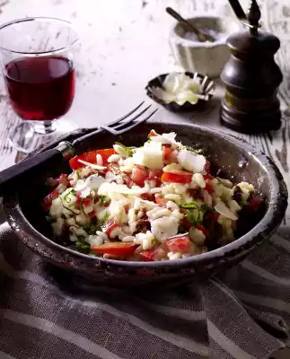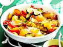 Drain the dried tomatoes and cut into cubes. Wash the tomatoes and peppers. Clean the paprika and cut into strips. Cut tomatoes into quarters, remove seeds and dice the flesh.