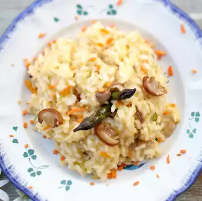 Wash the asparagus and cut off the woody ends generously. Cut the asparagus into bite-sized pieces. Clean and slice the porcini mushrooms. Peel, wash and finely dice the carrot. Peel onion and dice very finely.