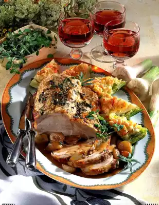 Press the garlic through a garlic press and roast it with the shallots after about 30 minutes of cooking time in a roasting pan, deglaze with 1/4 litre of water again and finish cooking. For the vegetables, clean and peel carrots and cut them into small cubes. Clean, wash and dice the peppers. Blanch both in boiling salted water for about 2 minutes. Clean, wash and slice the pointed cabbage. Cook in boiling salted water for about 3-5 minutes and drain. Separate egg, beat egg white until stiff. Mix carrots, paprika, cream cheese and egg yolk. Fold in the beaten egg white. Put pointed cabbage slices on a baking tray. Spread cream cheese mixture and butter in flakes on top. Bake in the preheated oven (electric: 200 °C/ gas: level 3) for about 12 minutes.