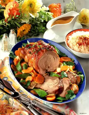 Remove bones from the meat. Wash the meat, dab dry and tie into shape with kitchen string. Rub meat with salt, pepper and coriander. Place on a fat pan and bake in a preheated oven (electric range: 175°C/ gas: level 2) for approx. 1 3/4 hours.