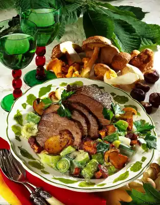 For the vegetables, clean and wash the leek and cut it into rings. Cook in 3/8 litres of boiling salted water for about 10 minutes. Also clean and wash porcini and chanterelles. Cut the porcini into slices.
