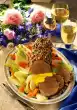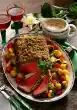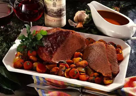 Bring sauce to the boil. Mix flour with 3-4 tablespoons of water until smooth and stir into the stock. Bring to the boil briefly. Cut the meat and arrange it on a plate with vegetables. Sprinkle with thyme leaves and garnish with the remaining herb bouquet. Add sauce extra