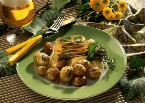 For the sauce, peel the garlic and press it through the garlic press. Season mayonnaise with salt, pepper and garlic. Wash potatoes thoroughly and dab dry. Heat olive oil. Fry the potatoes for 10-15 minutes, turning occasionally. Season to taste with salt, pepper and fresh thyme leaves. Serve aspic, potatoes and sauce garnished with fresh herbs