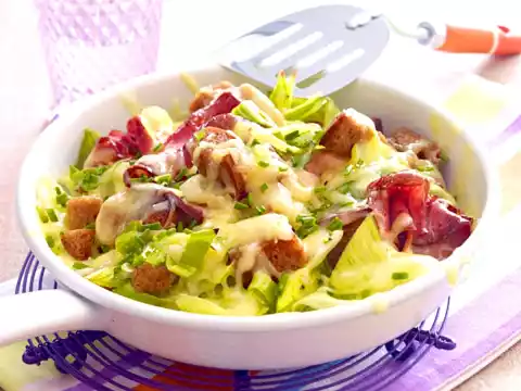 Sprinkle with the remaining cheese and bake in a preheated oven (electric oven: 225 °C/circulating air: 200 °C/gas: level 4) for approx. 10 minutes. Wash the chives, dab dry, cut into small rolls with kitchen scissors and sprinkle over.