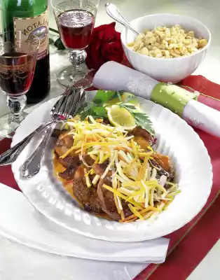 Fry the meat in hot lard from each side. Season with salt and pepper. Fry the onion and diced vegetables for about 2 minutes. Add flour and sweat on. Stir in 1/4 l water. Add stock, herbs, rose pepper and lemon. Cover and braise at medium heat for 20-30 minutes