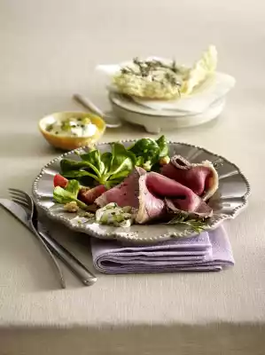 Peel the shallot, cut into fine cubes and stir into the vinaigrette. Remove roast beef from the salt crust and cut into slices. Arrange roast beef, salad and tartar sauce. Garnish with remaining herbs.
