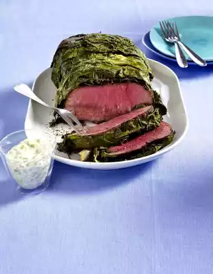 Cook in the preheated oven (electric cooker: 150 °C/ circulating air: 125 °C/ gas: see manufacturer) for 20-30 minutes. In the meantime, wash parsley, shake dry, pluck leaves from the stalks and chop finely. Cut the cucumbers into cubes. Stir salad cream and 4 tbsp. cucumber water until smooth. Season to taste with salt and pepper. Stir in parsley and cucumber. Remove the roast, wrap in aluminium foil and let it rest for about 10 minutes. Remove baking paper and cut roast into slices. Add remoulade