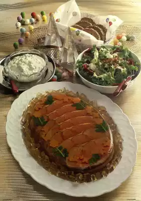 Pour a "mirror" into an oval form (approx. 2 litres capacity) and let it solidify in the refrigerator. Wash the parsley and pluck the leaves from the stems. Place carrot blossoms and parsley leaves on the mirror at the edge of the mould.