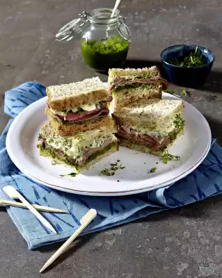 Spread 4 slices of toast with pesto and top with the roast beef slices. Spread remoulade on top. Cut the cress from the bed and sprinkle on the tartar sauce. Place the remaining slices of toast on top.