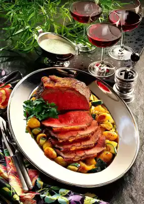 For the sauce, heat the fat in a saucepan, sauté the flour in it and deglaze with the milk. Let it boil well while stirring. Add herbs and season the sauce with salt and pepper. Remove the roast beef and let it rest for 5 minutes.