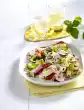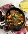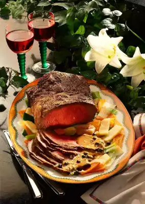 Remove fat and tendons from the roast beef. Place sections on the fat pan of the oven. Salt the meat and place on top, pour on 1/8 litre of water. Bake in the preheated oven (electric: 200 °C/ gas: level 3) for 20-25 minutes. In the meantime, peel and wash the carrots and celery and cut them into wide, flat strips of about 4 cm in length. Clean and wash the leek, cut lengthwise and also cut into strips. Mix egg white with breadcrumbs and coloured pepper. Turn the roast beef over and spread the pepper paste on the surface. Fry at the same temperature for another 20-25 minutes. In the meantime, peel, wash and grate the horseradish. Drain the capers. 5 minutes before the end of the cooking time, fry the carrots and celery strips in the fat. Add leek and 1/8 litre water, salt and steam covered for about 10 minutes. Remove roast beef from the oven and cover. Deglaze the roast beef with approx. 200 ml water, drain (results in approx. 1/4 litre), degrease and bring to the boil. Mix sour cream with flour, stir in. Add horseradish and capers and cook for about 5 minutes. Season to taste with salt and pepper. Cut the roast beef (add meat juice to the sauce) and serve with vegetables and sauce