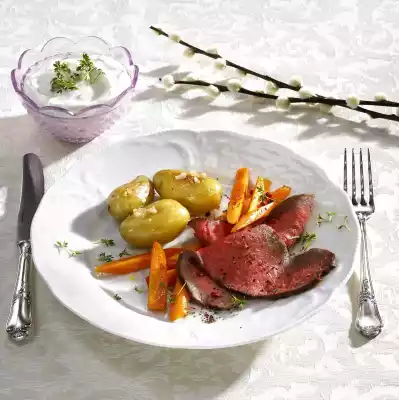 Wash and peel the carrots, cut them in half lengthwise and cut them diagonally into strips. Wash potatoes thoroughly. 30 minutes before the end of the roast beef cooking time, cook the potatoes in boiling water for about 20 minutes, drain.