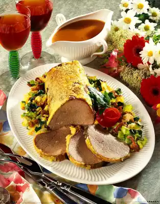 Refine with crème fraîche. Season to taste with salt and pepper. Arrange the meat and cabbage on a plate. Garnish with tomato rose, bay leaf and parsley. Serve with extra sauce. Boiled potatoes taste good with it.
