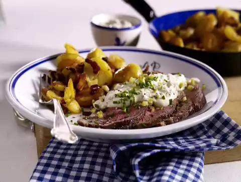 Season to taste with salt and pepper. Remove the meat and cut into slices. Arrange potatoes, meat and tartar sauce on plates. Sprinkle with chives and cucumbers.
