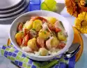 Add salt and pepper to taste. Drain the potatoes, rinse under cold water, drain and peel. Cut the potatoes into slices. Peel onion and cut into cubes.