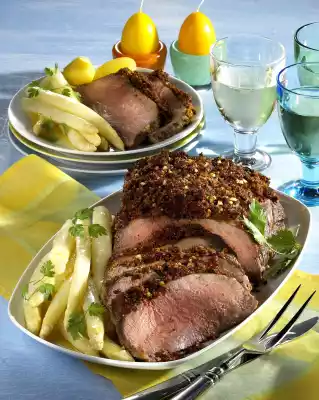 Lift the asparagus out of the water and keep warm in a damp cloth. Remove the layer of fat from the roast beef as desired. Place tomato crust on the meat and press on. Cook in the oven for another 10 minutes.