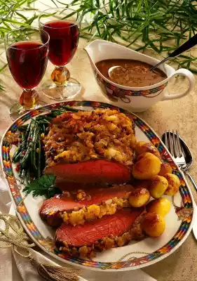 Heat 30 g clarified butter and pour over the meat. Bake in the preheated oven (electric: 225°C/ gas: level 4) for 35-40 minutes. After approx. 10 minutes, spread the crust mixture over the meat and press down lightly.