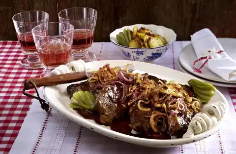 Fold the rendered bacon into the fried potatoes, season with salt and pepper. Season the boiled onion stock with salt, pepper and 1 pinch of sugar and thicken with sauce thickener. Arrange roast beef, onion sauce and fried potatoes on a plate. At the end, spread roasted onions extra over the meat. Garnish with cucumber fans