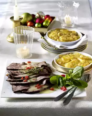 Remove meat from the oven. Gratinate potato gratin in the preheated oven (electric cooker: 225 °C/ convection oven: 200 °C/ gas: level 4) for 10-12 minutes. Cut the meat open. Arrange meat with sauce on a plate. Garnish with diced tomatoes, lamb's lettuce and thyme. Remove gratin from the oven and add