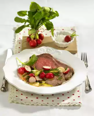 Remove the roast beef, wrap it in aluminium foil and let it rest for about 5 minutes. Sauté spring onions in hot oil. Add orange juice, bring to the boil, stir in stock. Add radishes and cook everything for about 1 minute. Season to taste with salt and pepper