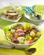 Wash and chop parsley and radish leaves. Remove the fat layer from the roast beef, cut the meat into slices. Arrange with vegetables and sprinkle with parsley and radish leaves. Goes well with fried potatoes