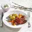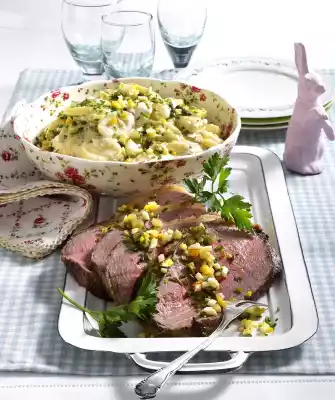 Drain capers. Put some herbs, egg and gherkin cubes aside. Mix yoghurt and mayonnaise, season with some salt and pepper. Mix with remaining herbs, cucumber, eggs and capers. Add tartar sauce to the potato salad, mix well and let it stand for another hour. Wash the roast beef, dab dry and rub with salt and pepper. Place on a fat pan of the oven. Heat clarified butter and pour over the meat. Roast in the preheated oven (electric cooker: 225 °C/ convection oven: 200 °C/ gas: level 4) for approx. 30 minutes. Then turn down the oven (electric cooker: 175 °C/ convection oven: 150 °C/ gas: level 2) and finish roasting in approx. 20 minutes (depending on height). Wrap the roast beef in aluminium foil and let it rest for 10-15 minutes. Season potato salad with salt and pepper again, arrange in a bowl and sprinkle with some of the remaining cucumber-egg-herbs mixture. Slice roast beef warm or cold, arrange on a large plate and sprinkle with the remaining cucumber-egg-herbs mixture. Garnish with parsley