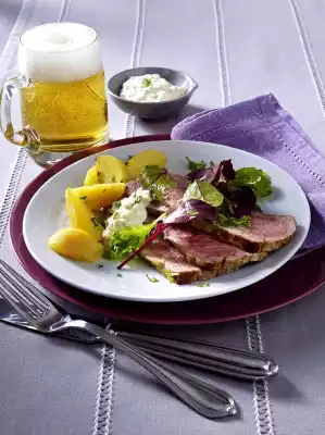 Remove meat from the oven, cover lightly with foil and leave to rest for 5-10 minutes. For the vinaigrette, mix 2 tablespoons of vinegar and honey. Gradually add olive oil. Season to taste with salt and pepper. Wash the salad and drain well. Cut the meat open and serve with potatoes, salad and some tartar sauce. Add the rest of the tartar sauce