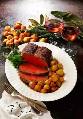 Rub roast beef with salt and pepper. Place on a baking tray and bake in a preheated oven (electric: 200 °C/ gas: level 3) for 35-40 minutes. Peel the shallots. Caramelise sugar in a pan until golden brown. Deglaze with vinegar and 1/8 litre water. Add the shallots, rosemary and bay leaf and let everything boil gently for about 15 minutes. Remove the roast beef. Leave to rest for 5 minutes, cut open and arrange on a plate with the shallots. Garnish with rosemary and parsley. Serve with baguette