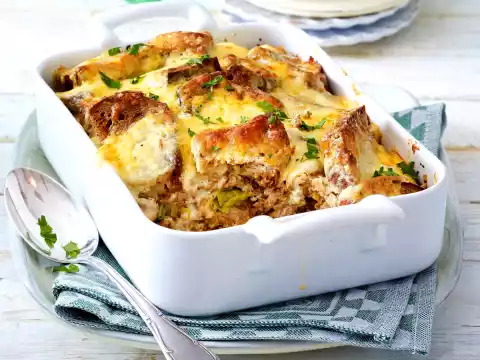 Pour in the chopping mass. Again 1⁄4 Spread the cast on it. Halve the rest of the bread and spread it on top. Pour the rest of the icing over it and sprinkle with the rest of the cheese. Bake in a hot oven for about 45 minutes.