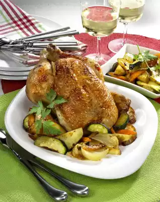 Wash the chicken and pat dry. Season inside and out with salt and pepper. Tie chicken wings and legs together with kitchen string and place on an oiled baking tray. Cook in the preheated oven (electric cooker: 175 °C/ convection oven: 150 °C/ gas: level 2) for approx. 30 minutes. In the meantime scrub the potatoes, peel and wash the carrots.