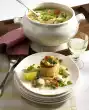 Onions peel, in columns cut. Peel, wash and chop carrots and potatoes. After 30 minutes add the onions to the chicken and season. Little by little pour on the remaining broth