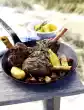 Prick a chicken leg with a roasting fork or a sharp knife. If the juice comes out clear, the chicken is cooked. Take it out and cut it into pieces. Cut the breast meat into slices.