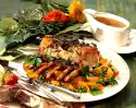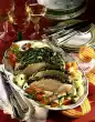 Cut both lemons into slices. Spread the roast with some herb paste after 1 hour. Arrange mushrooms, artichokes and lemons around the roast, sprinkle with 2 tablespoons of herb paste. Add the tomatoes 15 minutes before the end of the baking time. Season vegetables with salt and pepper. Pass the rest of the herb paste to the roast and vegetables. Delicious with baguette bread
