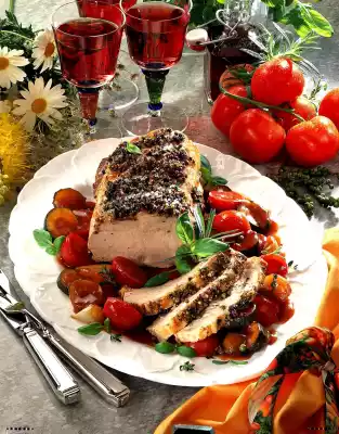 Deglaze with vinegar and roast stock, bring to the boil and season with salt. Cook onions for about 10 minutes, remaining vegetables for about 5 minutes and season again. Arrange roast and vegetables on a plate and serve garnished with herbs.