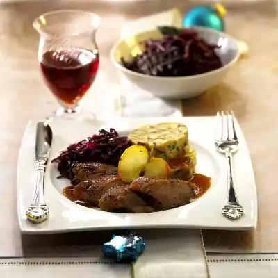 Put the meat on a baking tray. Add 5 tablespoons of broth. Bake in a preheated oven (grill function) for 10-15 minutes until crispy. Remove spices from the sauce. Heat the sauce again. Stir in butter and some duck fat. Serve with duck meat. Herr Schuhbeck recommends his chocolate blue cabbage and pretzel dumplings